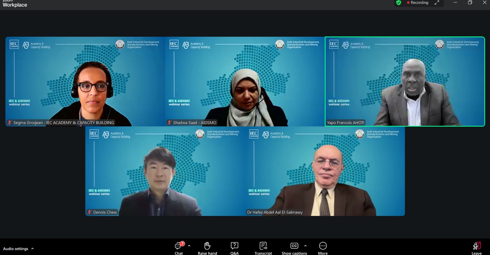 عقدت المنظمة العربية للتنمية الصناعية والتقييس والتعدين (AIDSMO) بالتعاون مع اللجنة الدولية الكهروتقنية (IEC) في إطار الاتفاقية الموقعة بين الطرفين، عبر تقنية الاتصال عن بعد اليوم الخميس 11 ديسمبر 2025 دورة تدريبية تحت عنوان: " إمكانات الهيدروجين الأخضر في المنطقة العربية ومتطلبات تطويره ". بتأطير الدكتور حافظ عبد العال الصلموي - أستاذ هندسة الطاقة بجامعة الزقازيق، مصر.